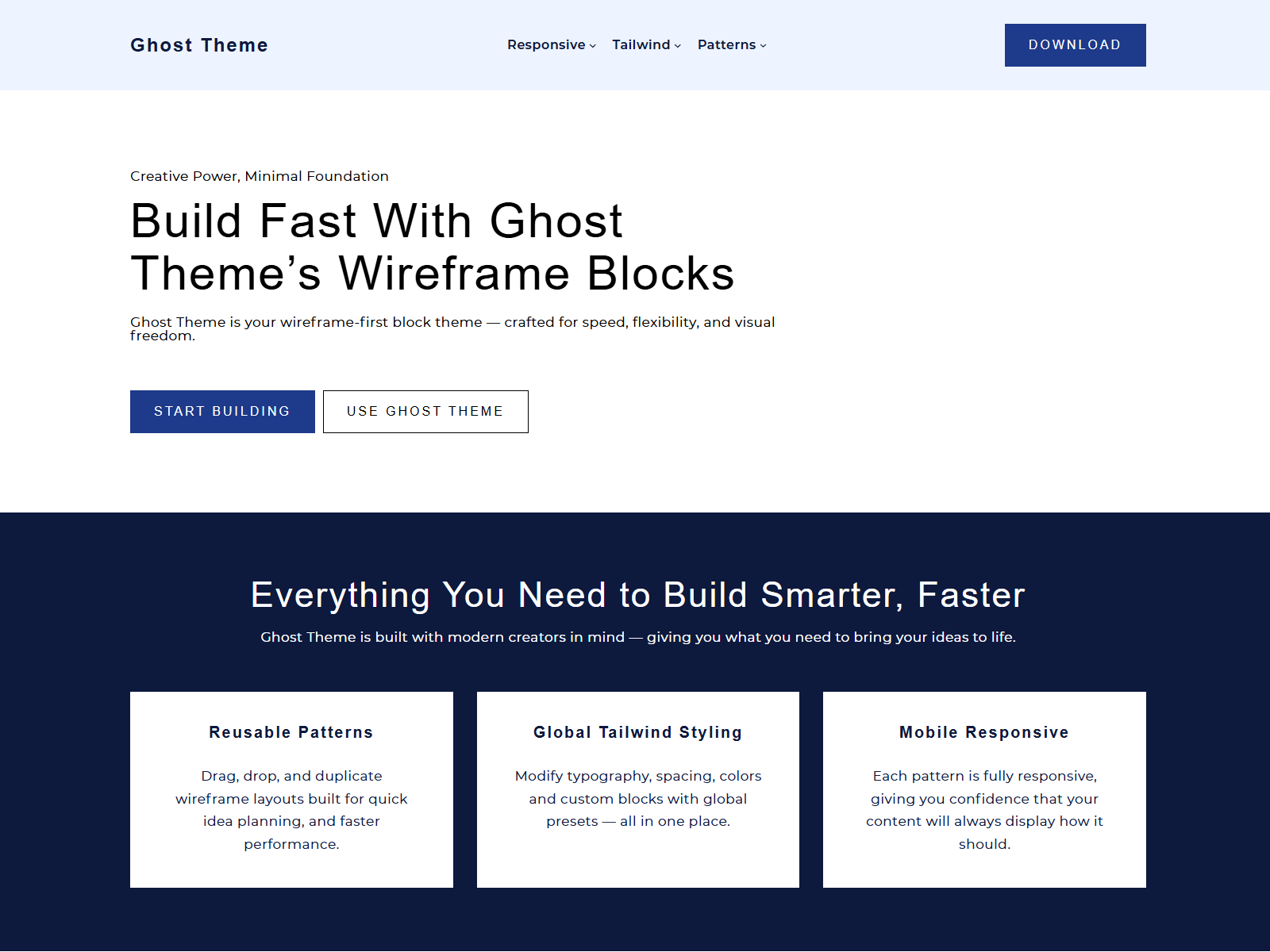 Ghost theme Build Fast Wireframe block builder for Wordpress Wizards